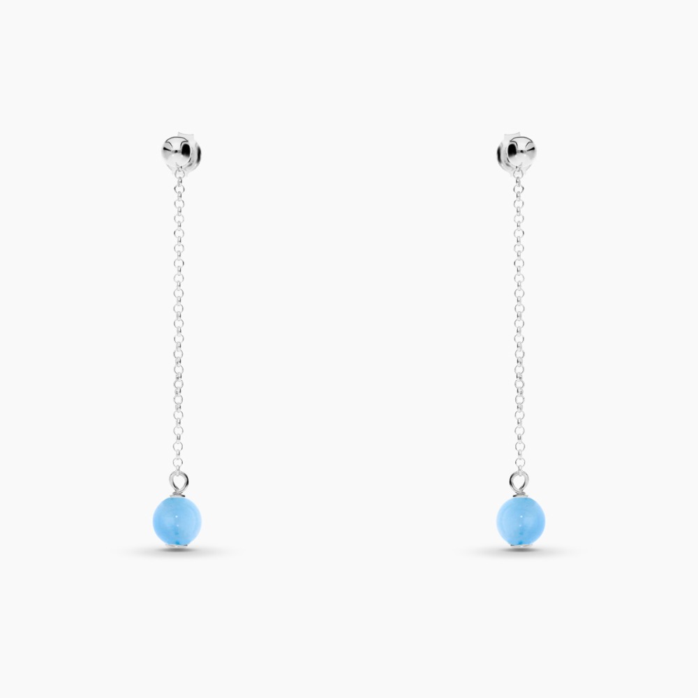 Kolczyki Sphere srebrne kulki i łańcuszek z akwamarynem