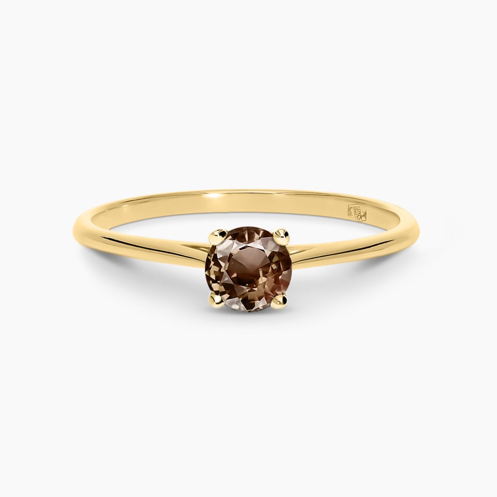 Niezwykły pierścionek wykonany z żółtego złota próby 0,585. Korona uformowana na kształt kwiatu została ozdobiona centralnie osadzonym kwarcem dymny, o pięknej barwie, którą podkreśla ciepły kolor kruszcu i zakute wokół niego szampańskie brylanty. To urokliwa i zachwycająca kompozycja dla pań lubiących elegancką biżuterię.