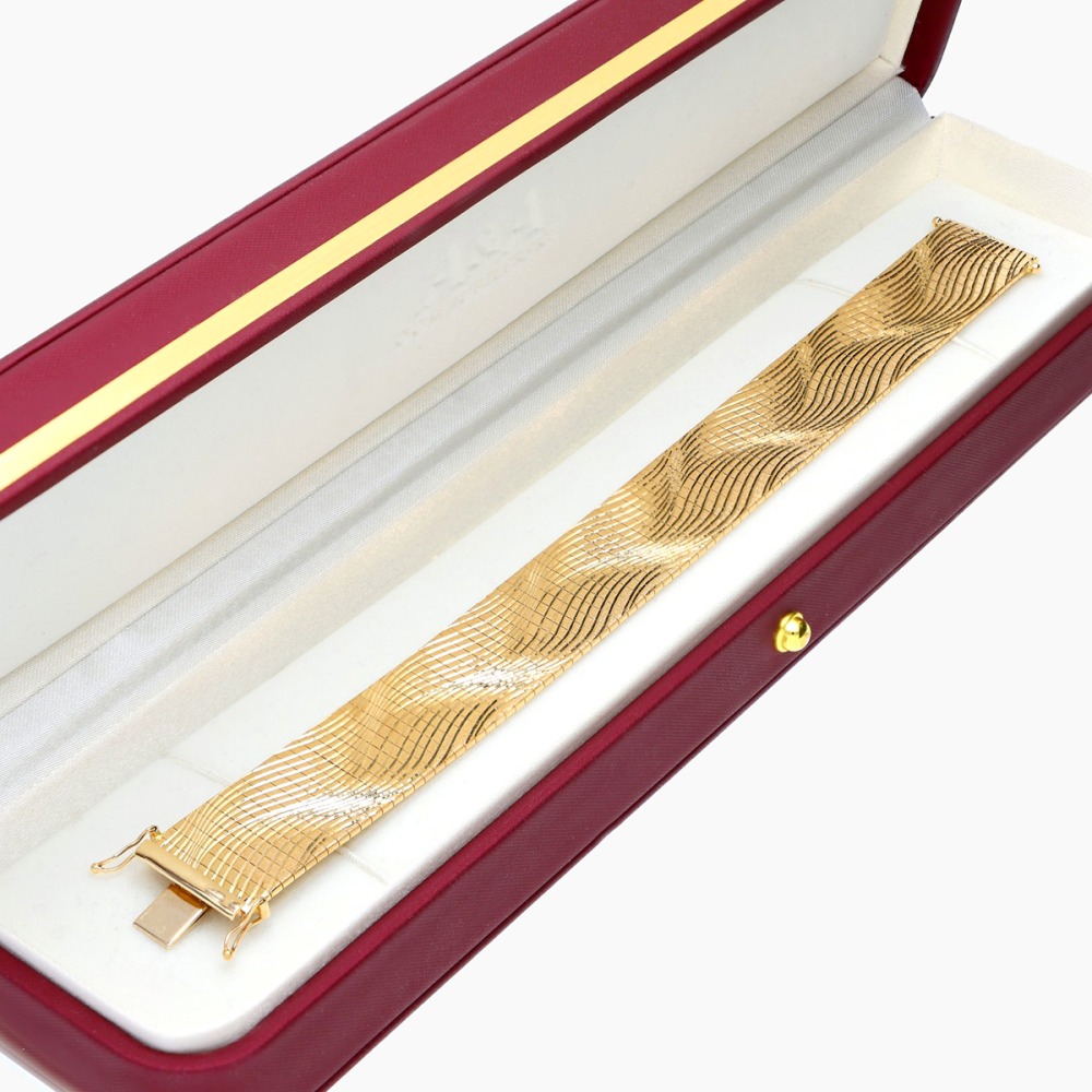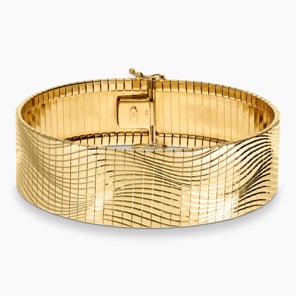 Wyjątkowa bransoletka wykonana z wysokiej jakości żółtego złota, charakteryzującego się wyjątkowym połyskiem. Posiada nowoczesny, subtelny wzór, z lekko falującą fakturą, która tworzy wrażenie ruchu i przestrzenności. Dzięki swojej szerokiej formie i wyrazistej strukturze, bransoleta doskonale przyciąga wzrok i stanowi elegancki akcent w każdej stylizacji. Zamek zapewnia bezpieczeństwo noszenia, a jednocześnie nie zakłóca estetyki biżuterii. Idealna na wyjątkowe okazje, ale także jako luksusowy element codziennych zestawów.