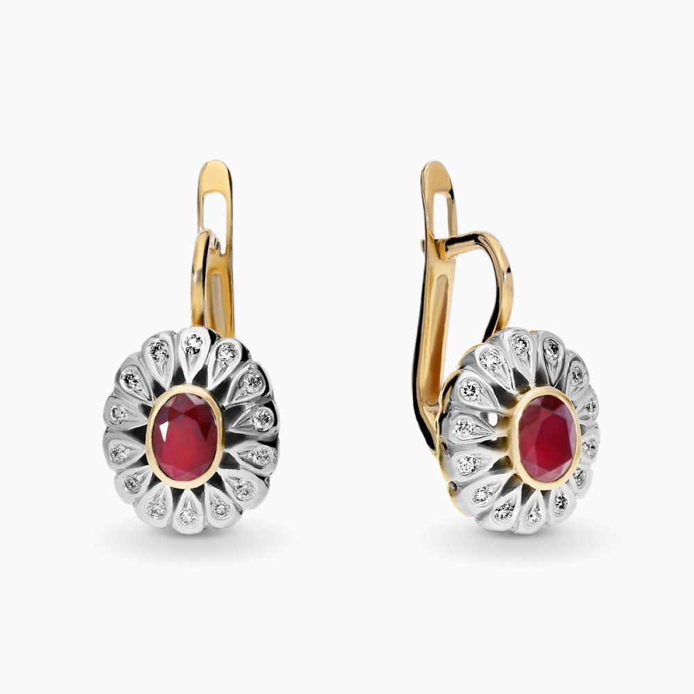 Kolczyki dwukolorowe złoto 585 z brylantami 0,18 ct i rubinami 0,64 ct