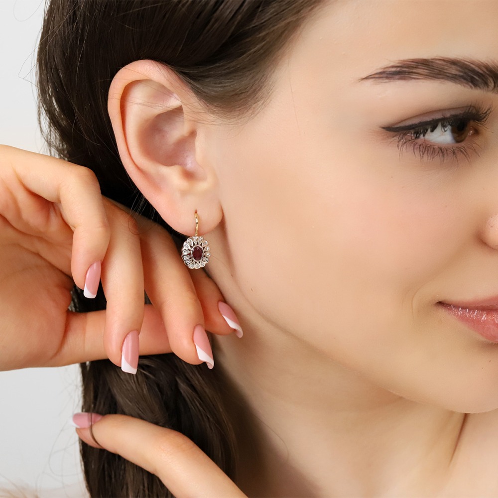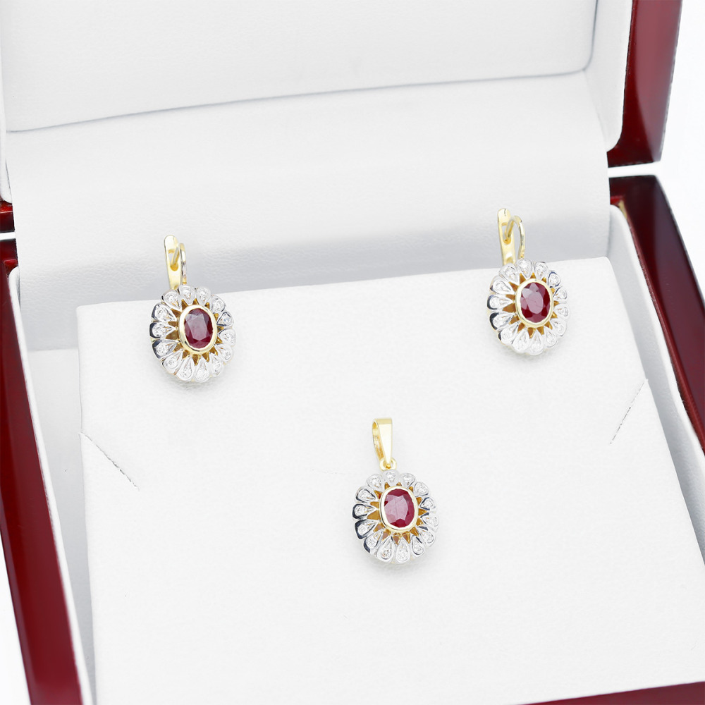 Zjawiskowe kolczyki z żółtego i białego złota próby 0,585 z rubinami o łącznej masie 0,64 ct i brylantami o łącznej masie 0,18 ct, wykonane w pracowni Domu Jubilerskiego A&A. Projekt powstał z dbałością o najdrobniejsze detale, przy użyciu materiałów najwyższej jakości. Starannie oprawione kamienie o niepowtarzalnym blasku sprawiają, że kolczyki zachwycają elegancją i będą wyjątkowym dodatkiem lub prezentem dla miłośniczki wyrafinowanej biżuterii.
