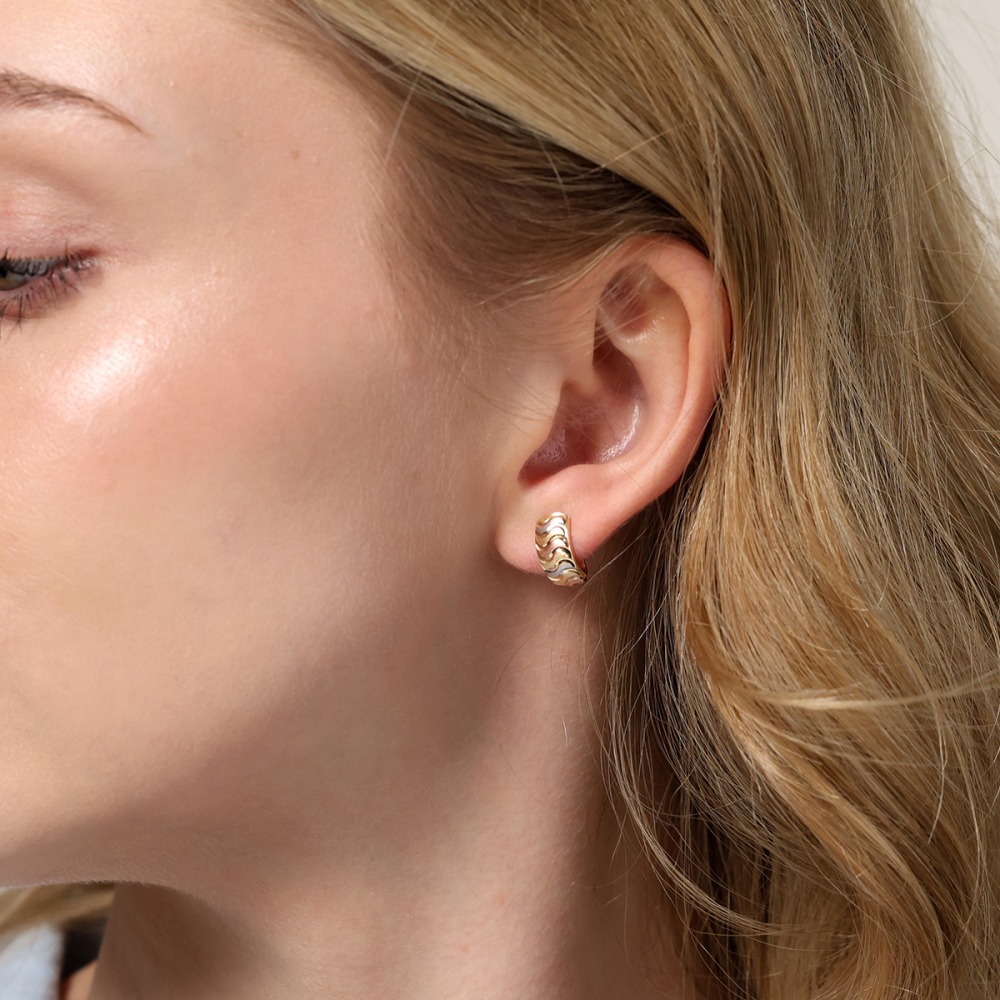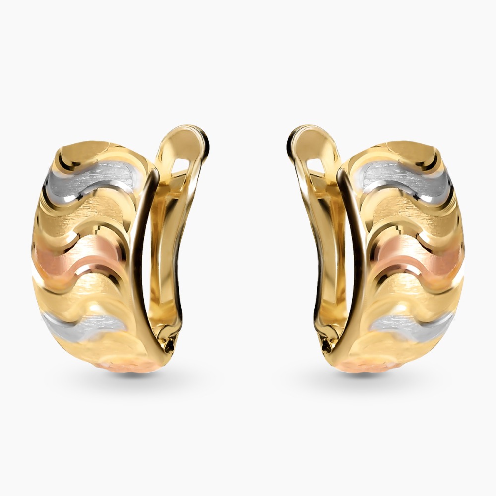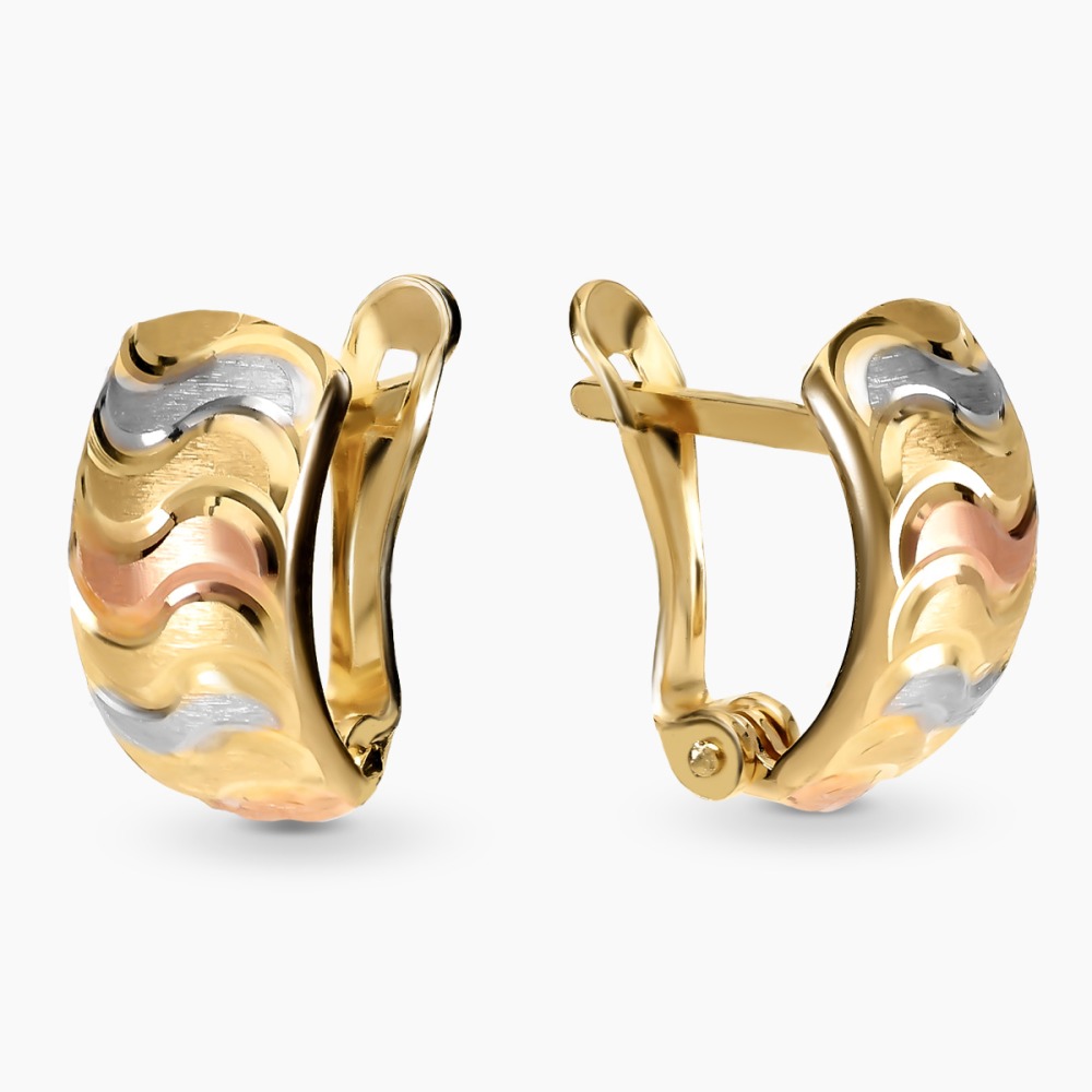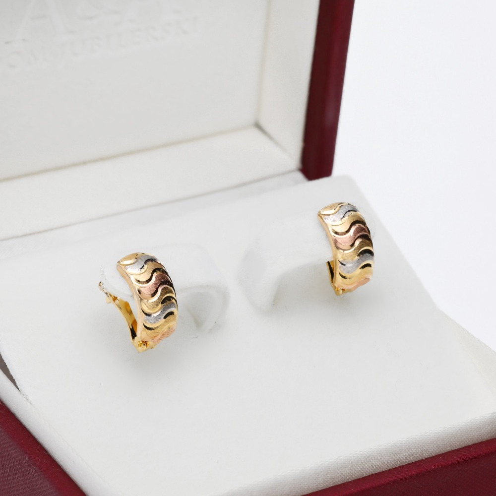 Wyjątkowe kolczyki z różowego, białego i żółtego złota próby 0,585 o bezpiecznym, angielskim zapięciu, dzięki czemu są bardzo komfortowe w noszeniu. Piękna kompozycja trzech kolorów drogocennego kruszcu doskonale komponuje się z inną biżuterią, lub zachwyca jako samodzielny dodatek. Ponadczasowe, eleganckie, sprawdzą się jako prezent na wiele okazji.