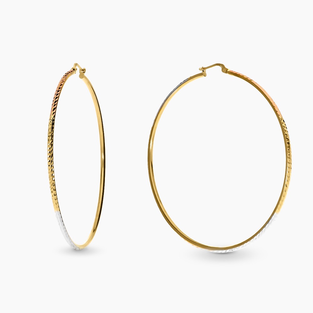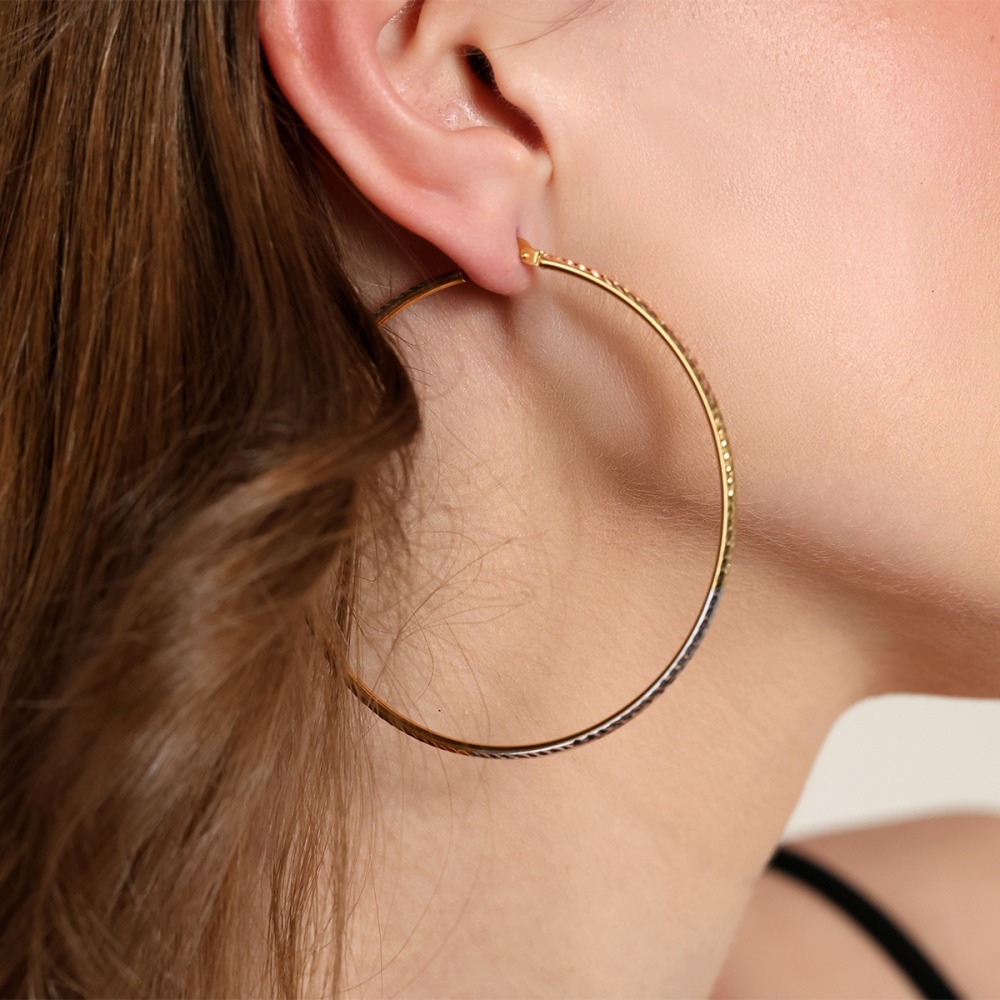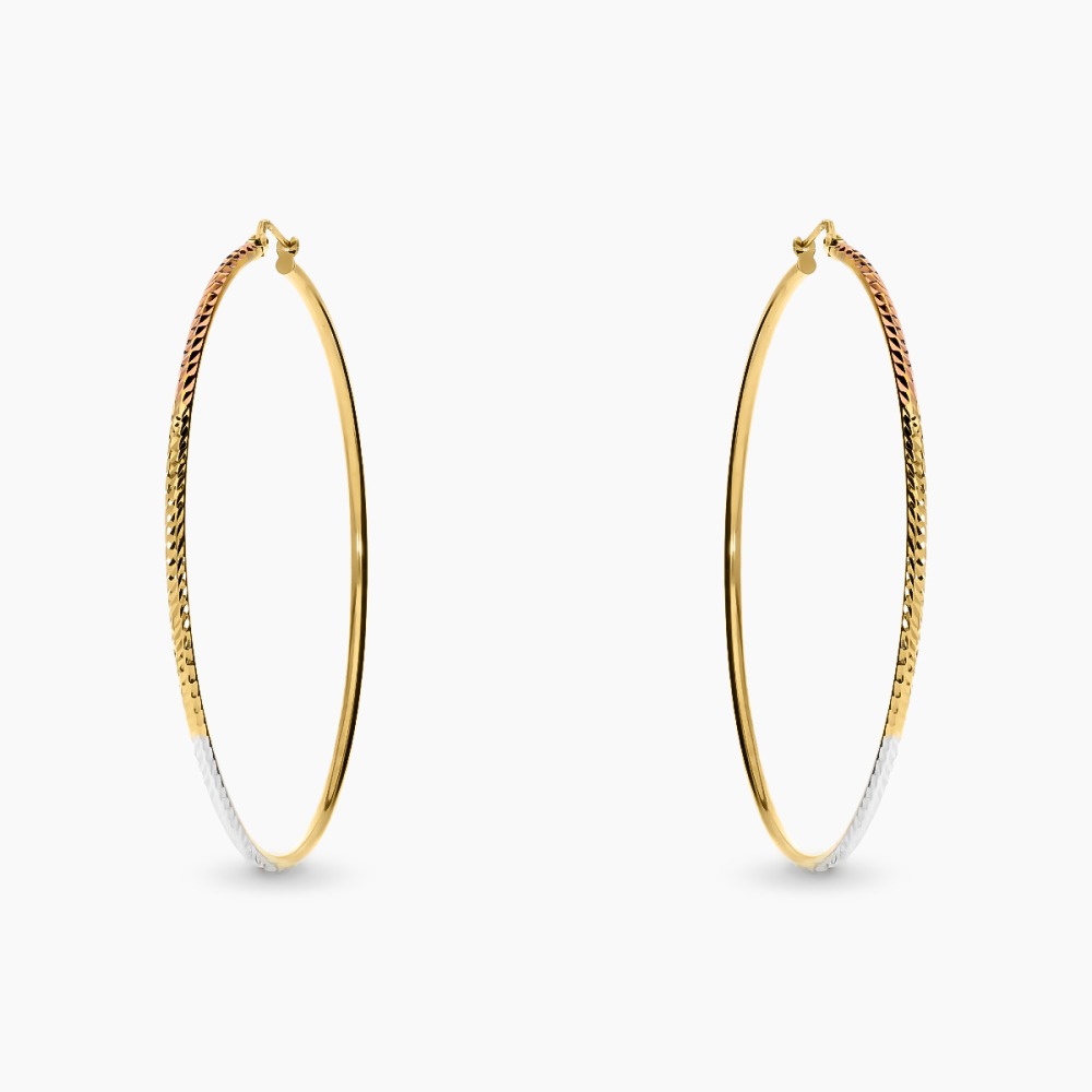Efektowne kolczyki w kształcie kół wykonane z żółtego, białego i różowego złota próby 0,585, o średnicy 6,4 cm. Ich grawerowana powierzchnia subtelnie odbija światło, podkreślając ciepły blask trójkolorowego kruszcu. Klasyczne i ponadczasowe, zostały stworzone z myślą o kobietach, które cenią geometryczne formy i najwyższą jakość wykonania.