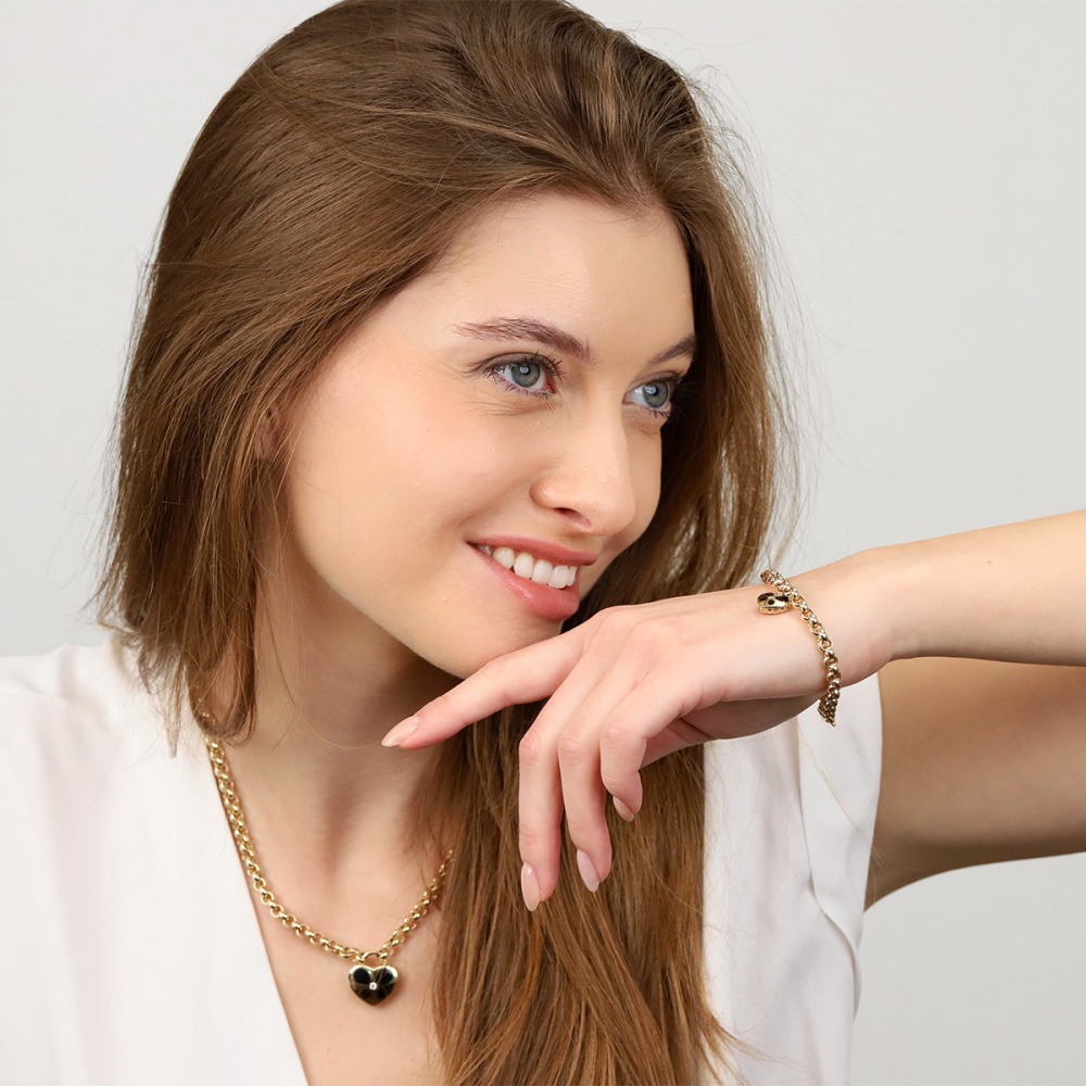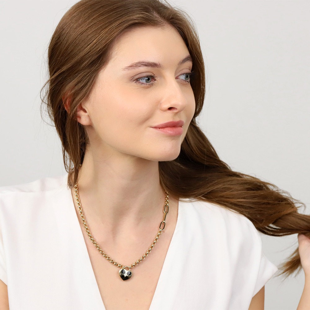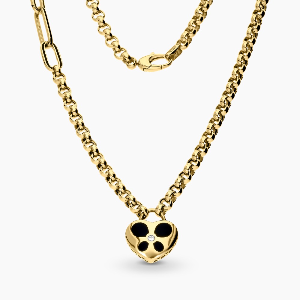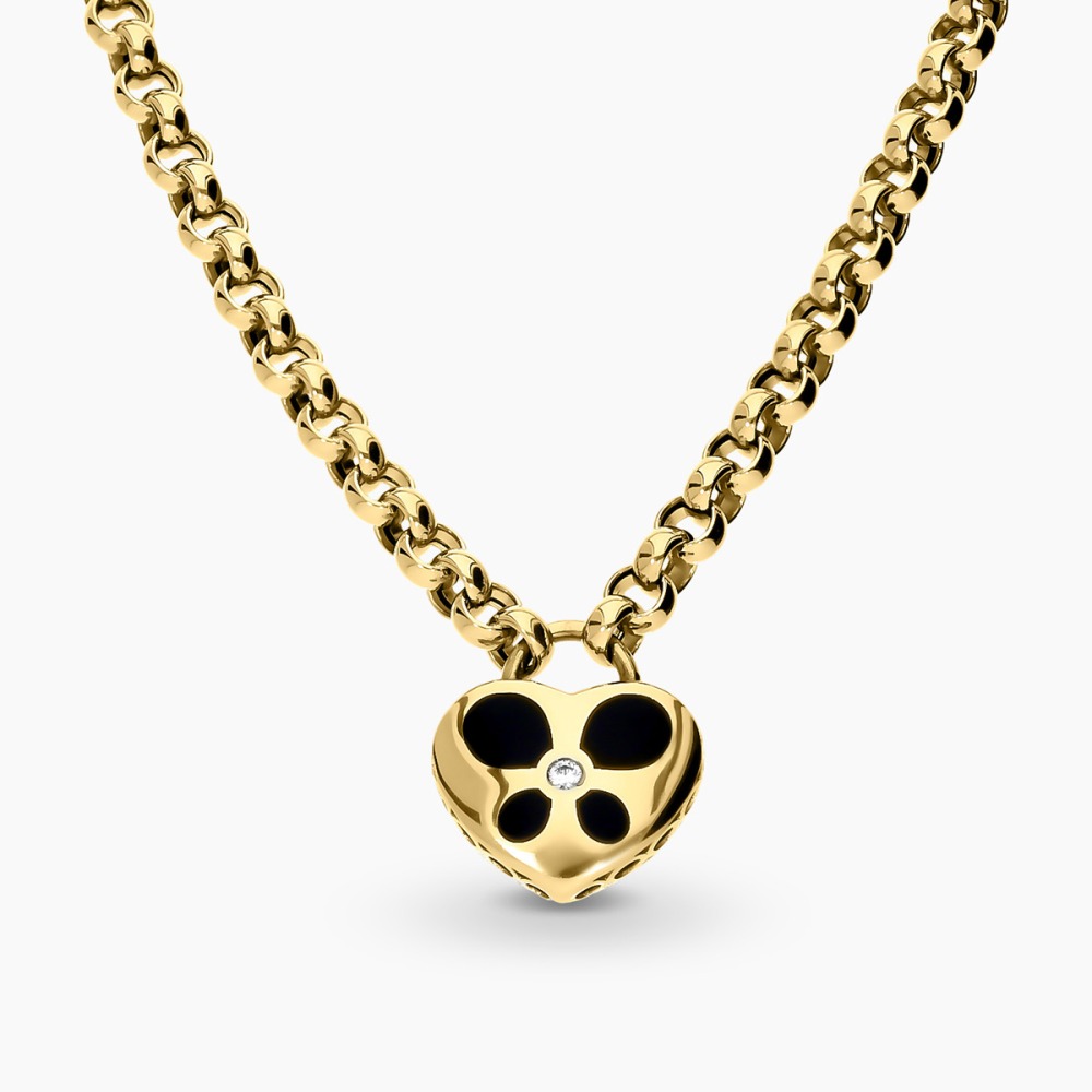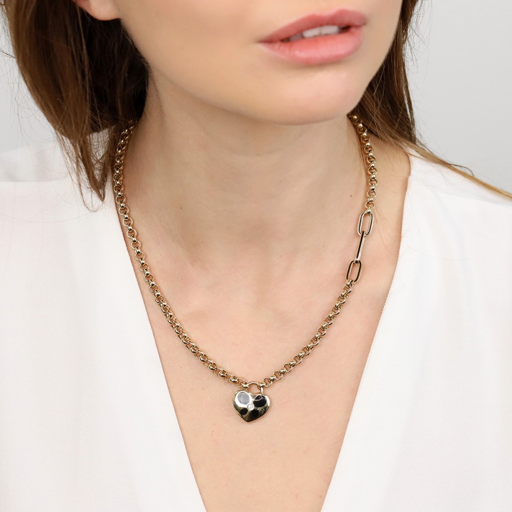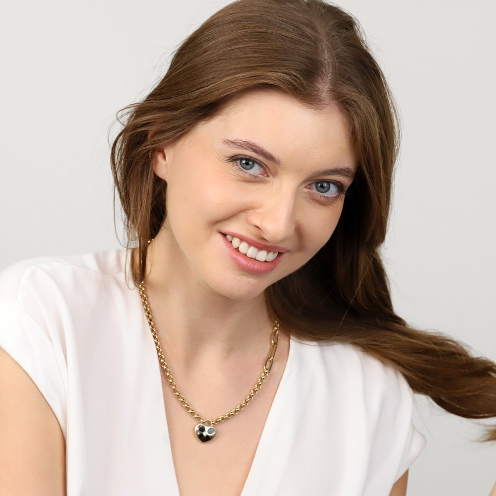 Modny i nowoczesny naszyjnik z żółtego złota próby 0,585 z zawieszką w kształcie serca. Element ozdobny zostały precyzyjnie wykończony po obu stronach emalią jubilerską i połyskującymi cyrkoniami. Dwa rodzaje splotów: rolo i ankier, nadają kompozycji niebanalnego charakteru, dzięki czemu naszyjnik wspaniale prezentuje się na dekolcie. Fantastyczny model pasujący do wielu stylizacji.