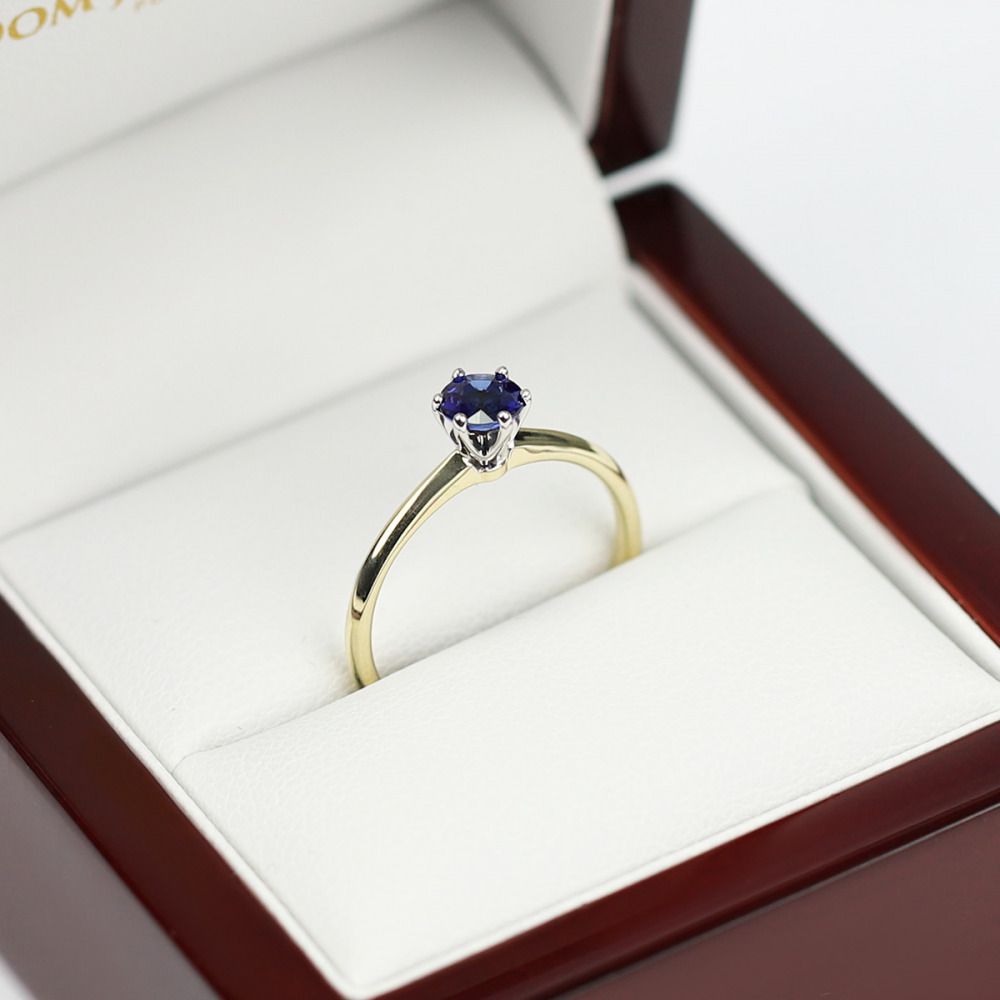 Zjawiskowy pierścionek wykonany z żółtego i białego złota próby 0,585 z sześcioramienną koroną w której z doskonałą precyzją zakuty został szafir o masie 0,53 ct. Niepowtarzalny urok pierścionka dodatkowo został podkreślony blaskiem brylantu o masie 0,01 ct ukrytego w szynie pierścionka. Całość zachwyca piękną, klasyczną formą oraz ponadczasowym wyglądem. Subtelna i pełna wdzięku kompozycja dedykowana dla pań lubiących otaczać się eleganckimi dodatkami.