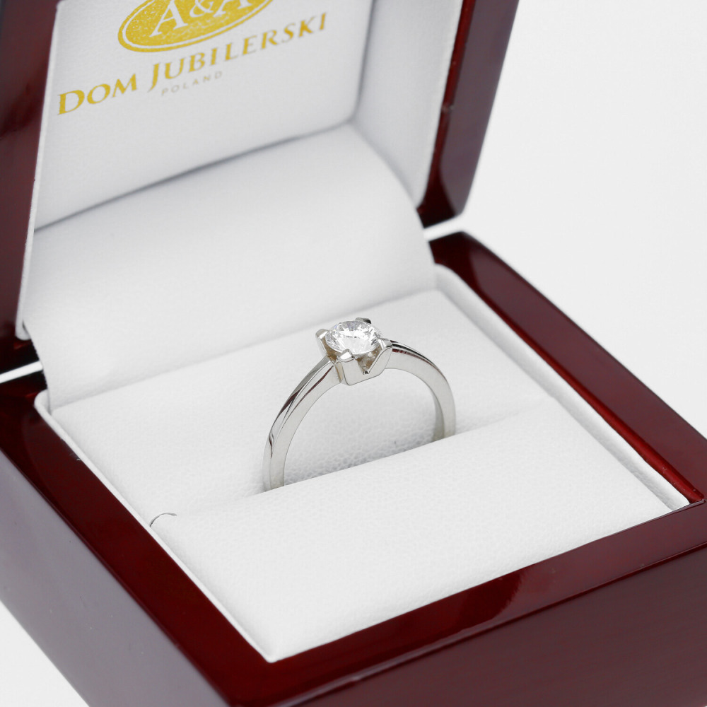 Klasyczny i ponadczasowy pierścionek z białego złota próby 0,585. Zachwyca najwyższą jakością wykonania, oraz wspaniałą oprawą olśniewającego brylantu zakutego w koronie pierścionka. Drogocenny kamień idealnie komponuje się z kruszcem o zimnej barwie i przyciąga wzrok niezwykłym blaskiem. Ten wspaniały pierścionek zaręczynowy z pewnością wyrazi wzajemną miłość i będzie pięknym symbolem na lata.