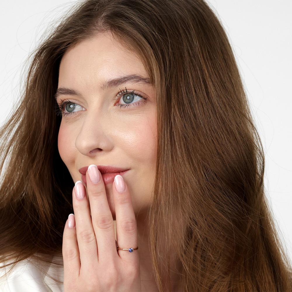 Subtelny pierścionek wykonany w pracowni A&A z różowego złota próby 0,585. Prosta forma i nowoczesny styl zachwyci niejedną kobietę, która jest miłośniczką ponadczasowej i delikatnej biżuterii. Pierścionek urzeka precyzyjnie zakutym tanzanitem, który na tle ciepłego odcienia kruszcu prezentuje się znakomicie. Delikatny wzór sprawdzi się jako piękna ozdoba dłoni jednocześnie będzie idealnym prezentem na wiele okazji.