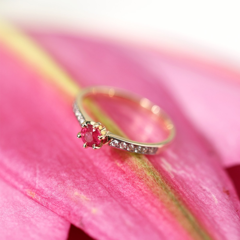 Pierścionek zaręczynowy Ravenna żółte i białe złoto 585 z brylantami 0,10 ct i rubinem 0,45 ct