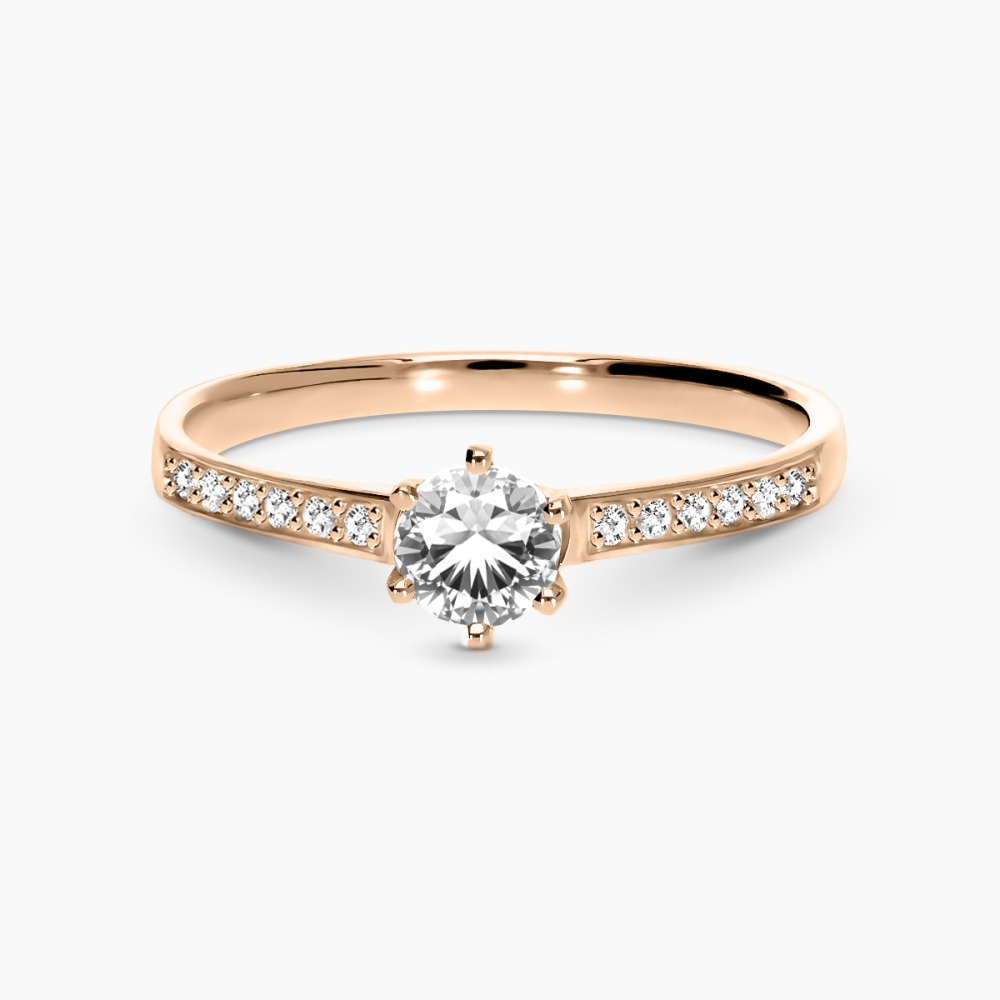 Zjawiskowy pierścionek wykonany w pracowni Domu Jubilerskiego A&A z różowego złota próby 0,585. W sześcioramiennej koronie z precyzją oprawiono biały topaz o masie 0,40 ct, urzekający pięknym szlifem. Brylanty osadzone w szynie pierścionka dodają kompozycji blasku i ponadczasowej elegancji, doskonale komponując się z kruszcem o ciepłej barwie. To znakomita propozycja na zaręczyny lub wyjątkowy prezent na inną, ważną okazję.