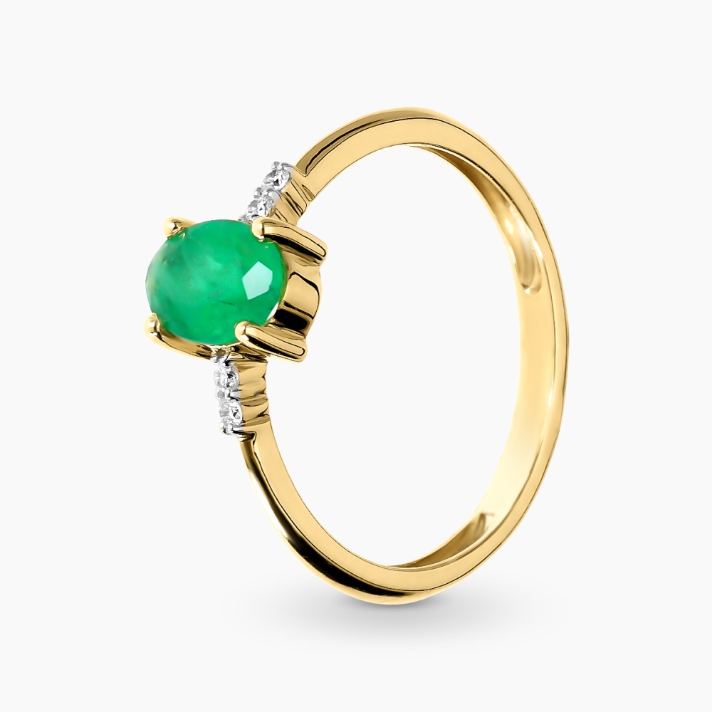 Niezwykle elegancki pierścionek wykonany z żółtego i białego złota próby 0,585. Jego centralnym elementem jest zjawiskowy, owalny szmaragd o masie 0,65 ct. Przepiękna barwa szlachetnego kamienia została podkreślona blaskiem drobnych brylantów oraz oprawą łączącą dwa kolory kruszcu. Pierścionek doskonale sprawdzi się jako niebanalna propozycja na zaręczyny lub wyjątkowy prezent na inne ważne okazje