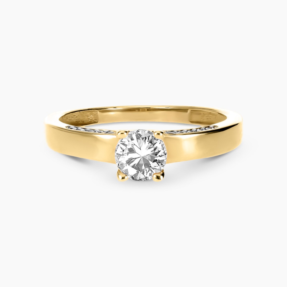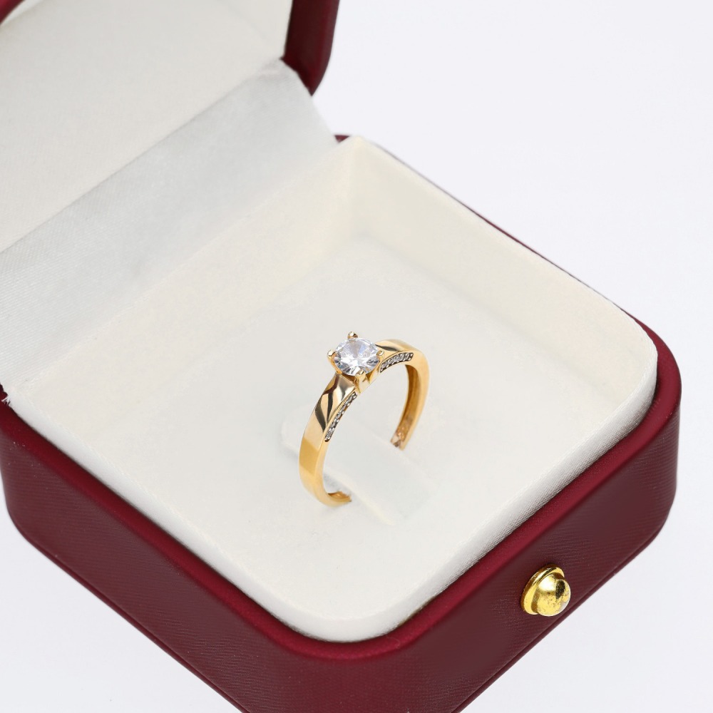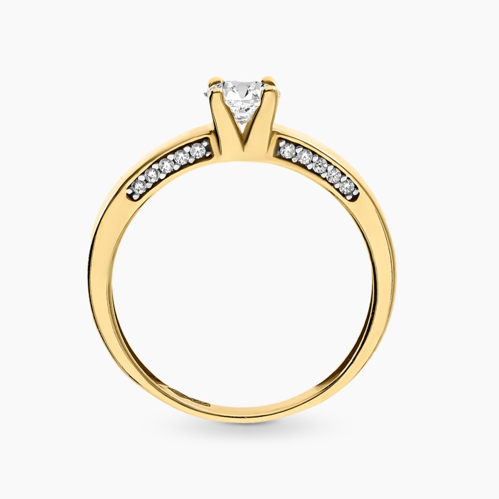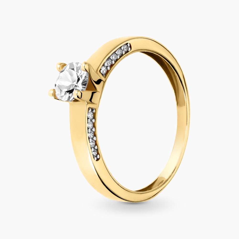 Elegancki pierścionek wykonany z żółtego złota, ozdobiony centralną, lśniącą cyrkonią w oprawie czterech łapek. Po bokach szyny umieszczono drobne cyrkonie, które subtelnie podkreślają blask głównego kamienia i dodają całości wyjątkowego uroku. Klasyczny design oraz precyzyjne wykonanie sprawiają, że pierścionek prezentuje się niezwykle szlachetnie i ponadczasowo.