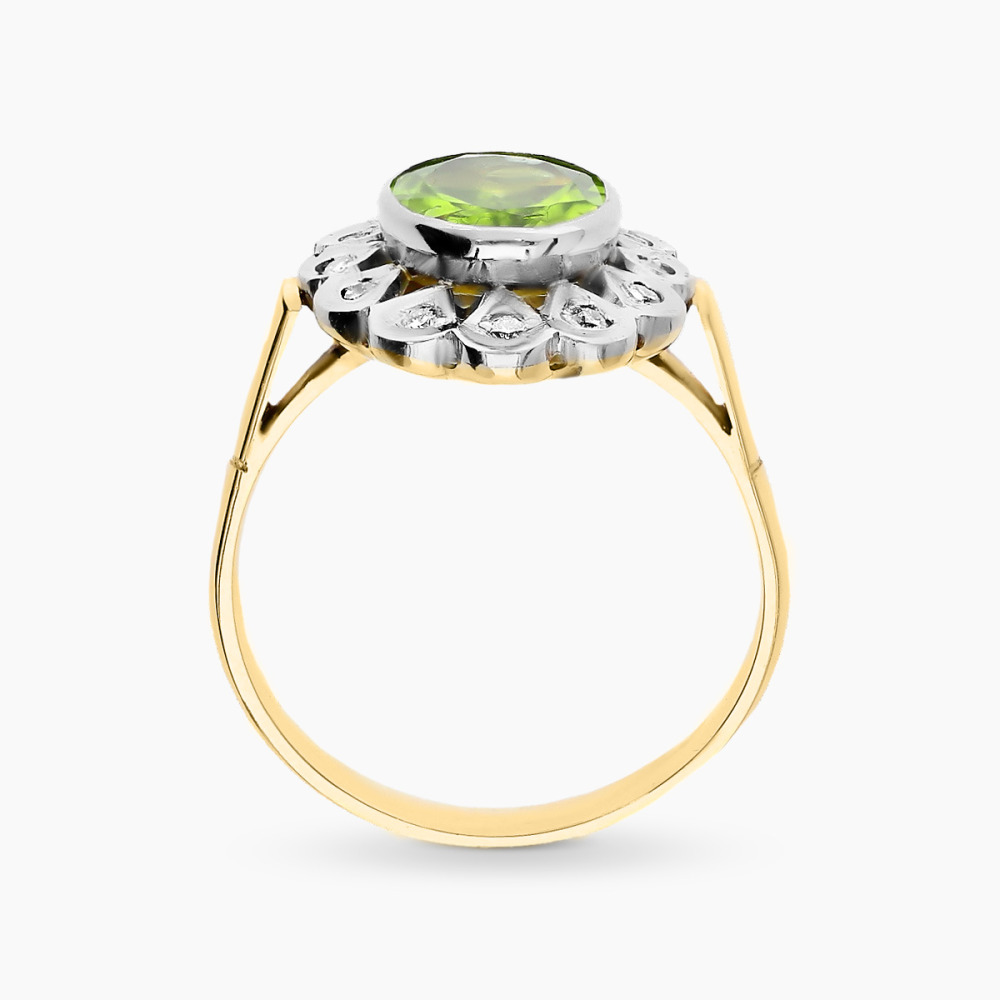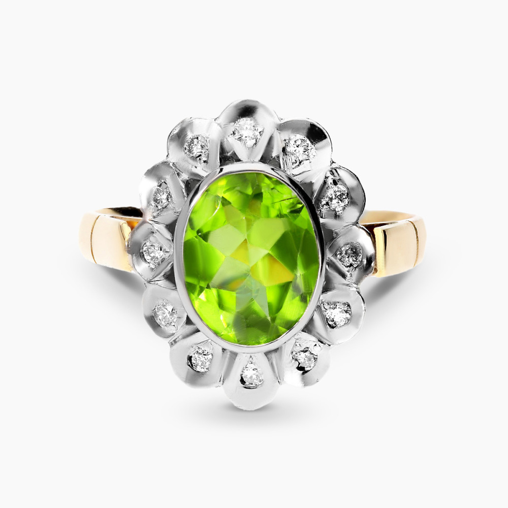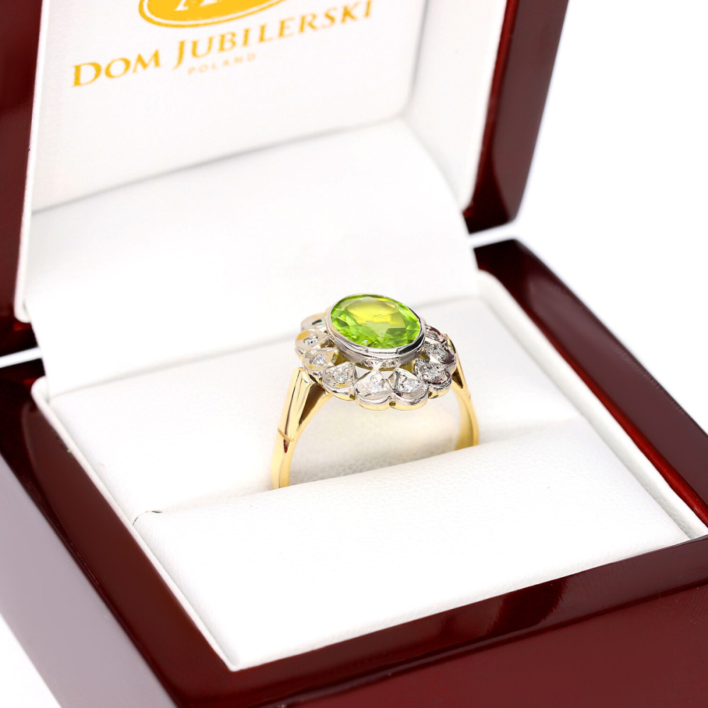 Pierścionek z dwukolorowego złota 585 z brylantami 0,17 ct i oliwinem 2,42 ct