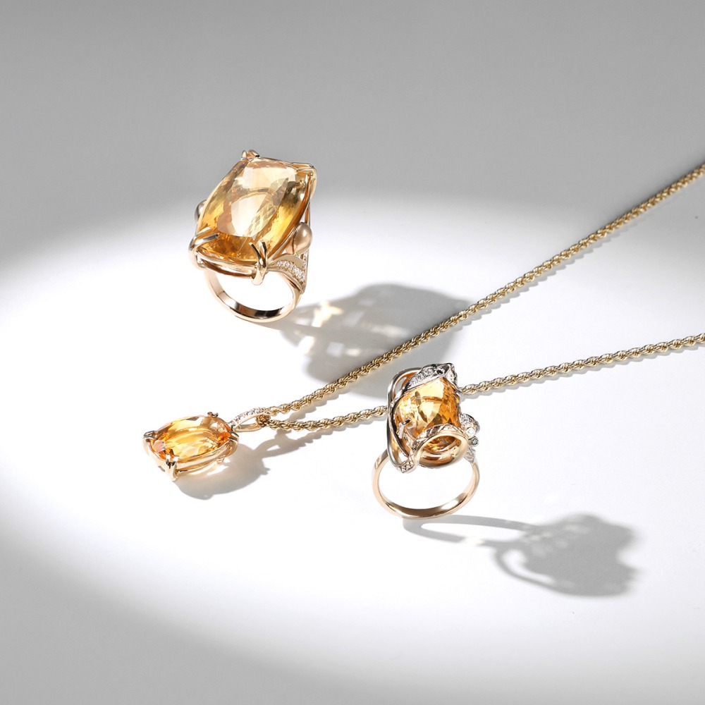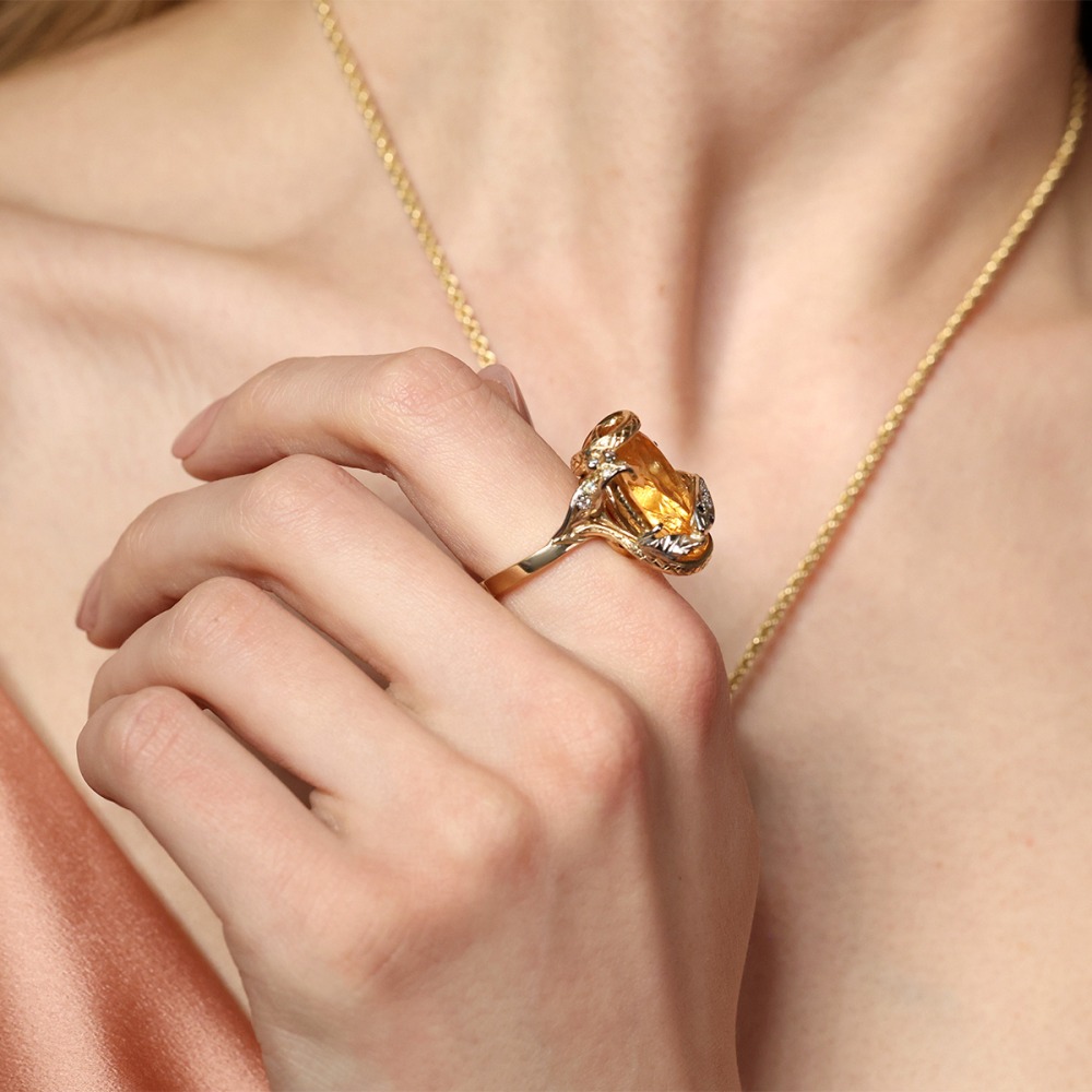 Niezwykle efektowny pierścionek z żółtego złota próby 0,585 z okazałym cytrynem i brylantami. Charakteryzuje się oryginalnym wzornictwem i wyjątkowym stylem. Centralny kamień o masie 12,9 ct odznacza się perfekcyjnym szlifem i piękną głębią koloru, natomiast nieprzemijający blask brylantów o masie 0,09 ct nadaje całości wyrafinowany charakter. Odważna i pełna wdzięku kompozycja dedykowana dla pań lubiących otaczać się wyszukaną i niebanalną biżuterią.