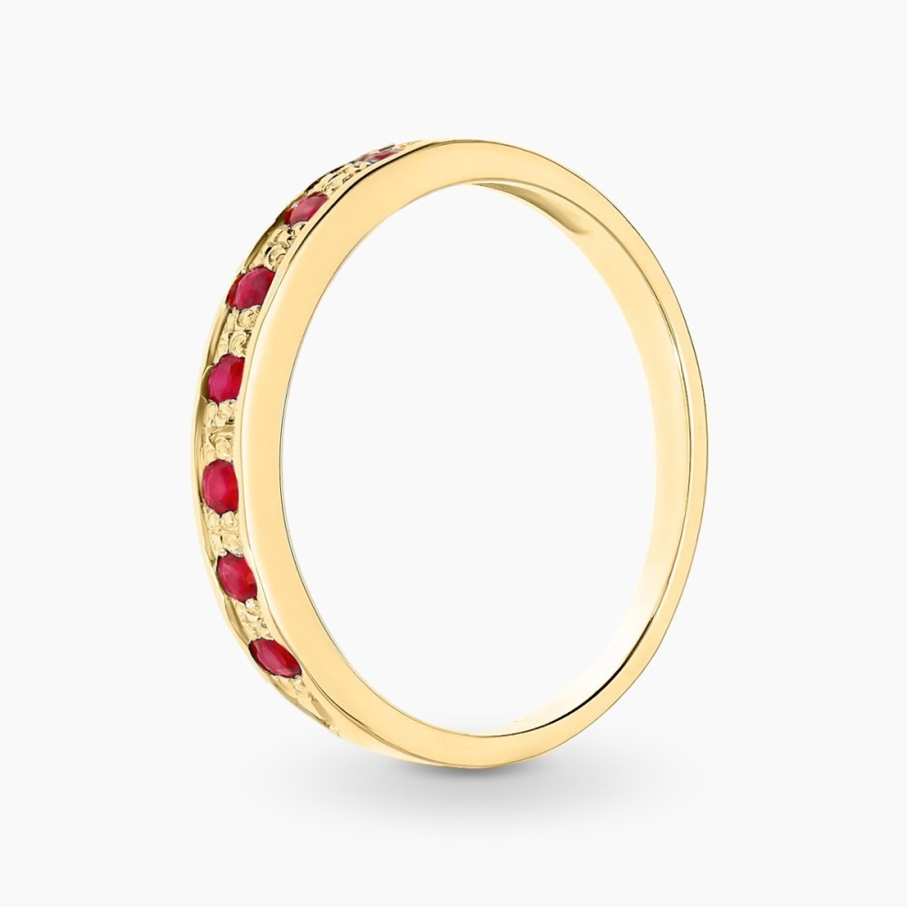 Wyjątkowy pierścionek w formie obrączki, wykonany z żółtego złota próby 0,585 z dbałością o każdy detal w pracowni Domu Jubilerskiego A&A. Zachwyca najwyższą jakością wykonania, ponadczasowym stylem oraz intensywną, malinową barwą naturalnych rubinów, które wspaniale komponują się z ciepłym odcieniem złota. Pełen wdzięku pierścionek jest wygodny w noszeniu i pięknie prezentuje się zarówno solo, jak i w zestawieniu z innymi elementami biżuterii.