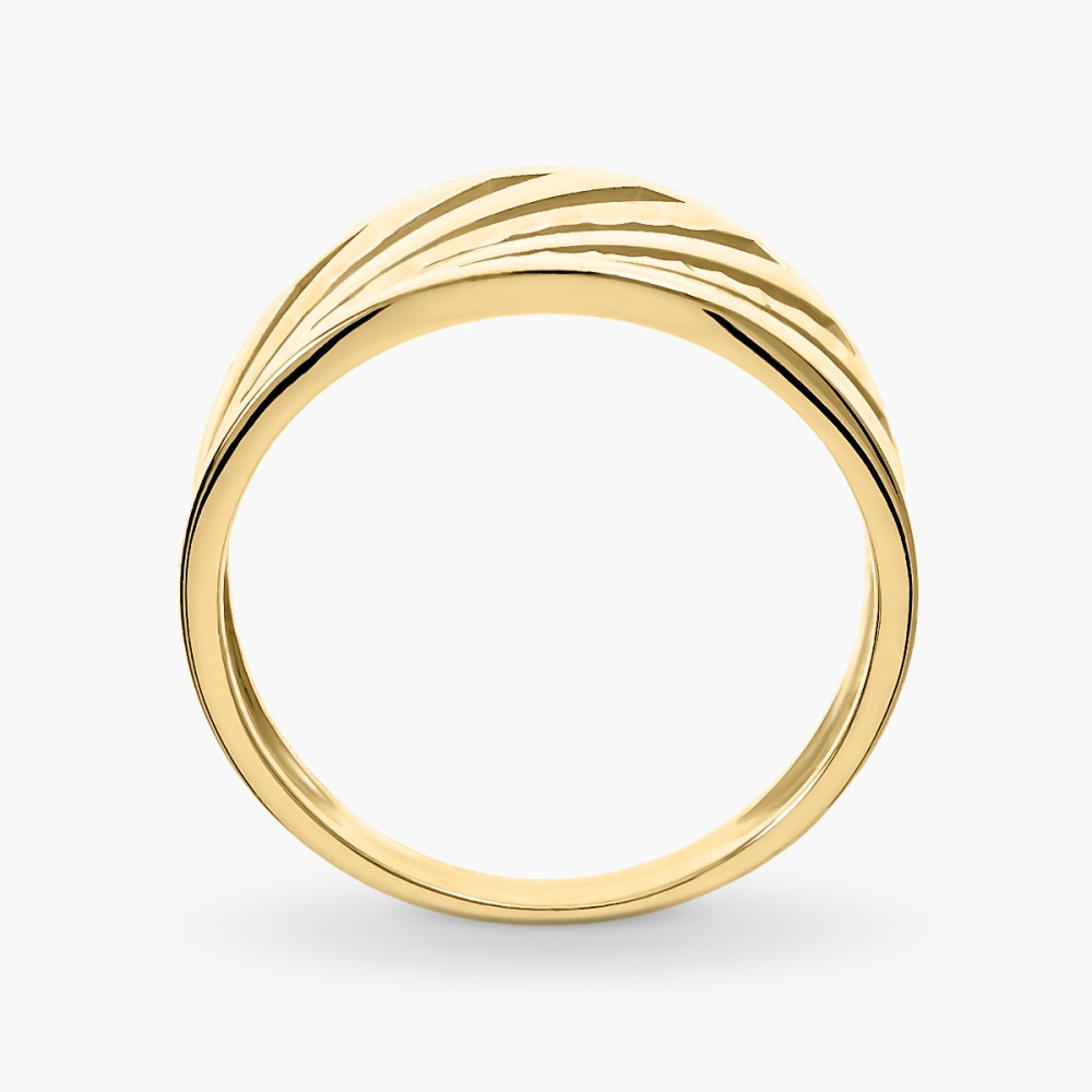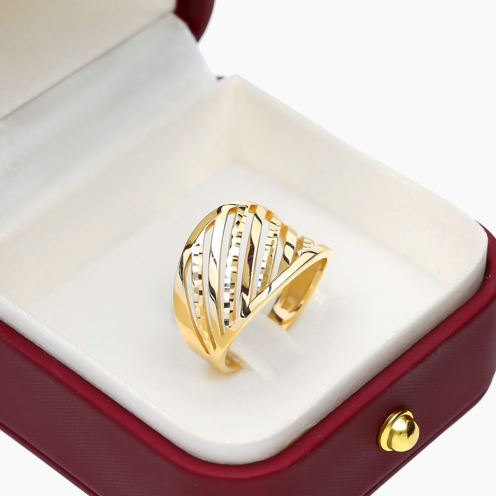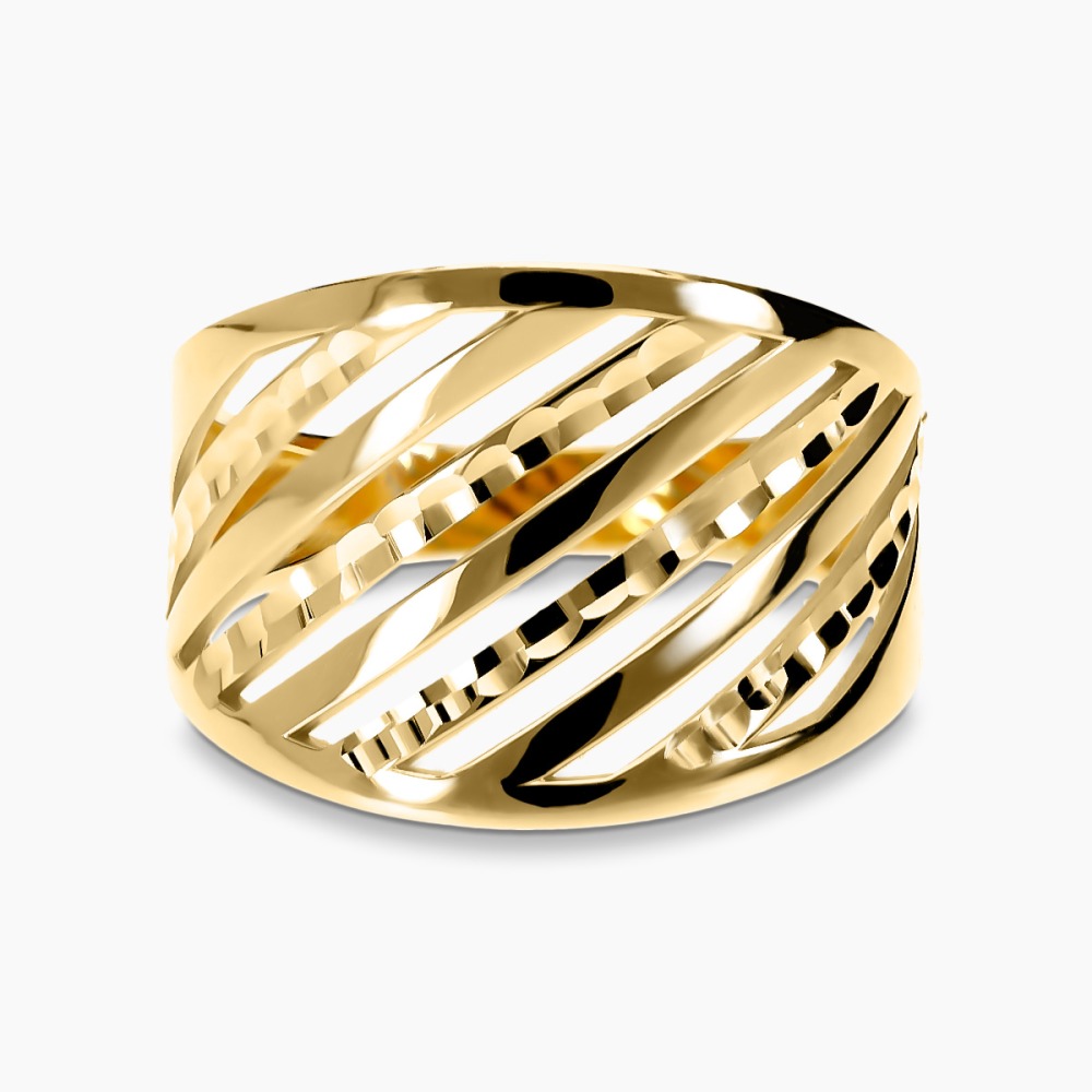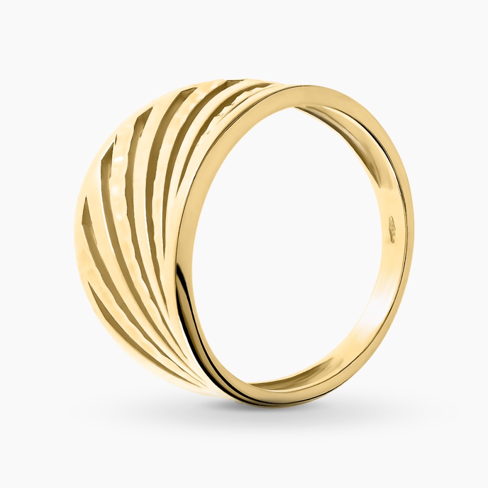 Okazały pierścionek wykonany z żółtego i białego złota próby 0,585. Uwagę przyciągają ażurowe wykończenie, które przyciąga wzrok i podkreśla piękny kolor kruszcu. Dzięki swojej formie jest niezwykle komfortowy w noszeniu i pięknie wygląda na dłoni. Idealnie sprawdzi się na prezent dla miłośniczki biżuterii bez kamieni.