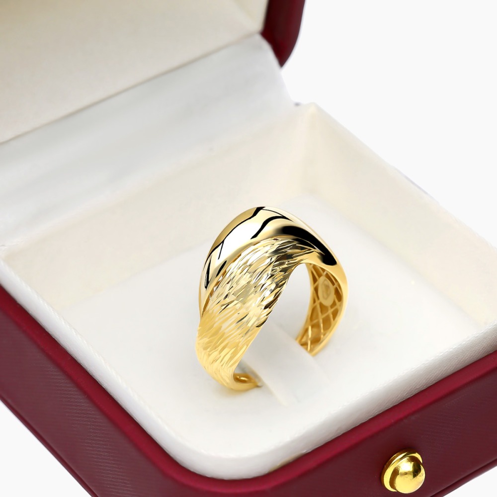 Nowoczesny pierścionek z żółtego złota próby 0,585. Urzeka oryginalną formą oraz starannym wykończeniem, które efektownie odbija światło, nadając biżuterii wyjątkowy blask. Szerokość pierścionka sprawia, że doskonale wyróżnia się na dłoni, przyciągając spojrzenia. To idealny, samodzielny akcent, który doda charakteru codziennym stylizacjom.