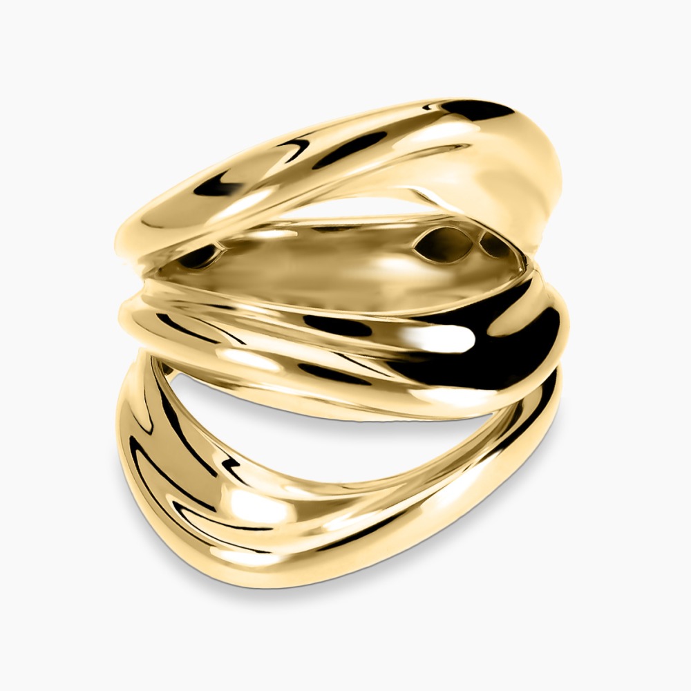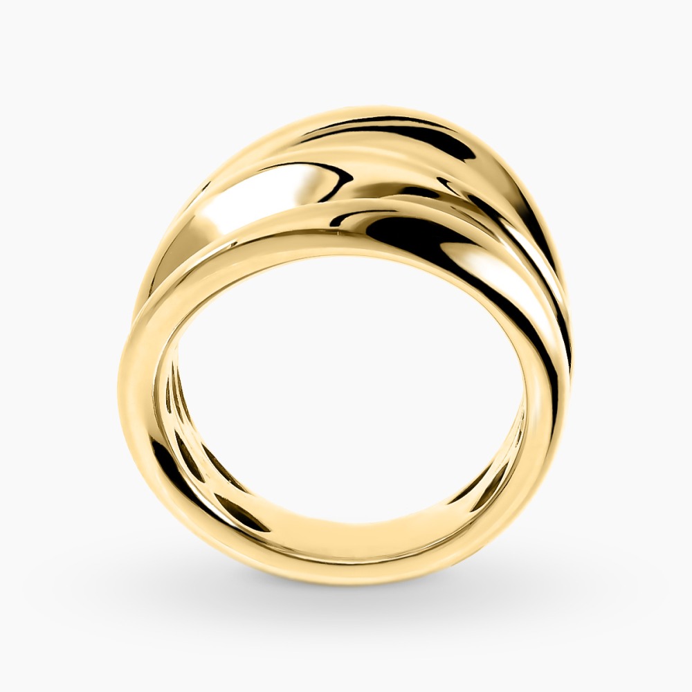 Okazały, nowoczesny pierścionek wykonany z żółtego złota próby 0,585. Jego asymetryczna, przeplatana forma nadaje biżuterii niepowtarzalnego charakteru, a ciepły blask kruszcu subtelnie przyciąga wzrok. Pierścionek doskonale układa się na dłoni, tworząc efektowny, a zarazem elegancki dodatek, który podkreśla indywidualny styl i świetnie sprawdzi się w codziennych oraz bardziej formalnych stylizacjach.