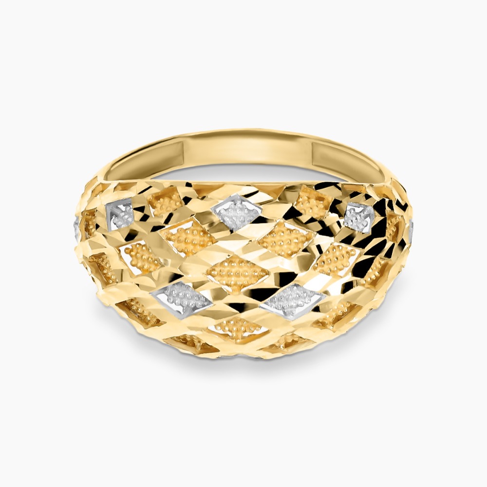 Okazały pierścionek wykonany z dwukolorowego złota próby 0,585 o ażurowym zdobieniu. Jego niebanalny, oryginalny design nadaje biżuterii wyjątkowego charakteru, a kontrastujące kolory kruszcu pięknie podkreślają każdy detal. Pierścionek doskonale układa się na dłoni, subtelnie przyciągając wzrok i stanowiąc efektowny, elegancki dodatek.