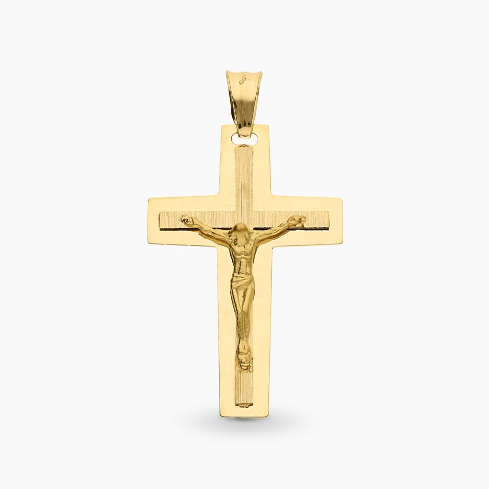 Zawieszka w kształcie krzyżyka wykonana z żółtego złota z elementami w satynie. Będzie stanowić idealną pamiątkę na Chrzest, Pierwszą Komunię czy Bierzmowanie.