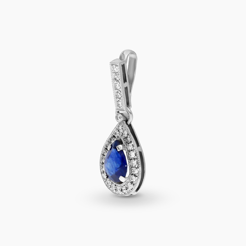 Niezwykle kobieca zawieszka z białego, palladowego złota próby 0,585 z szafirem w kształcie łezki o masie 1,35 ct, otoczonym brylantami o masie 0,31 ct. Wyrób wykonany ręcznie przez mistrza jubilerstwa w pracowni Domu Jubilerskiego A&A z największą dbałością o detale. Zimny kolor kruszcu idealnie wydobywa intensywny kolor kamienia centralnego i blask brylantów. Zachwycająca kompozycja dedykowana dla romantycznych pań ceniących klasyczne formy.