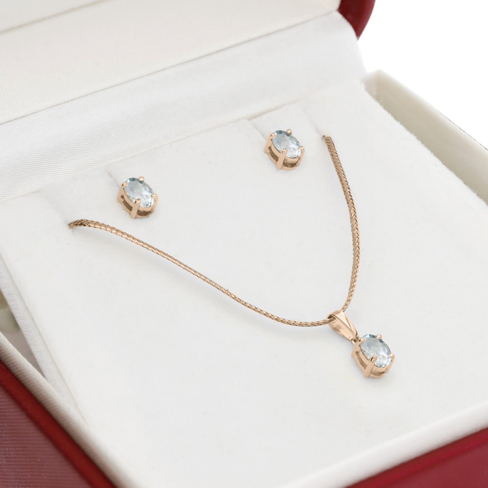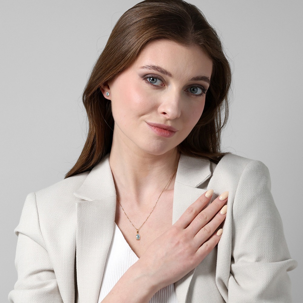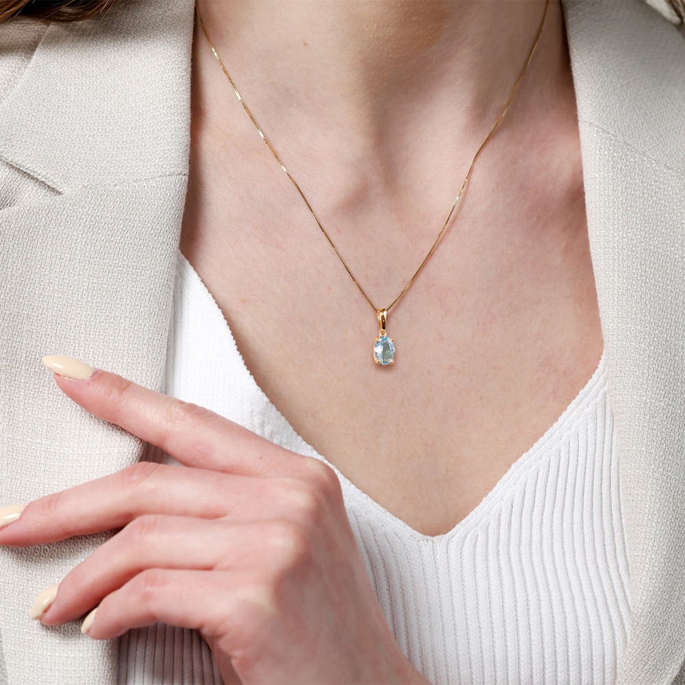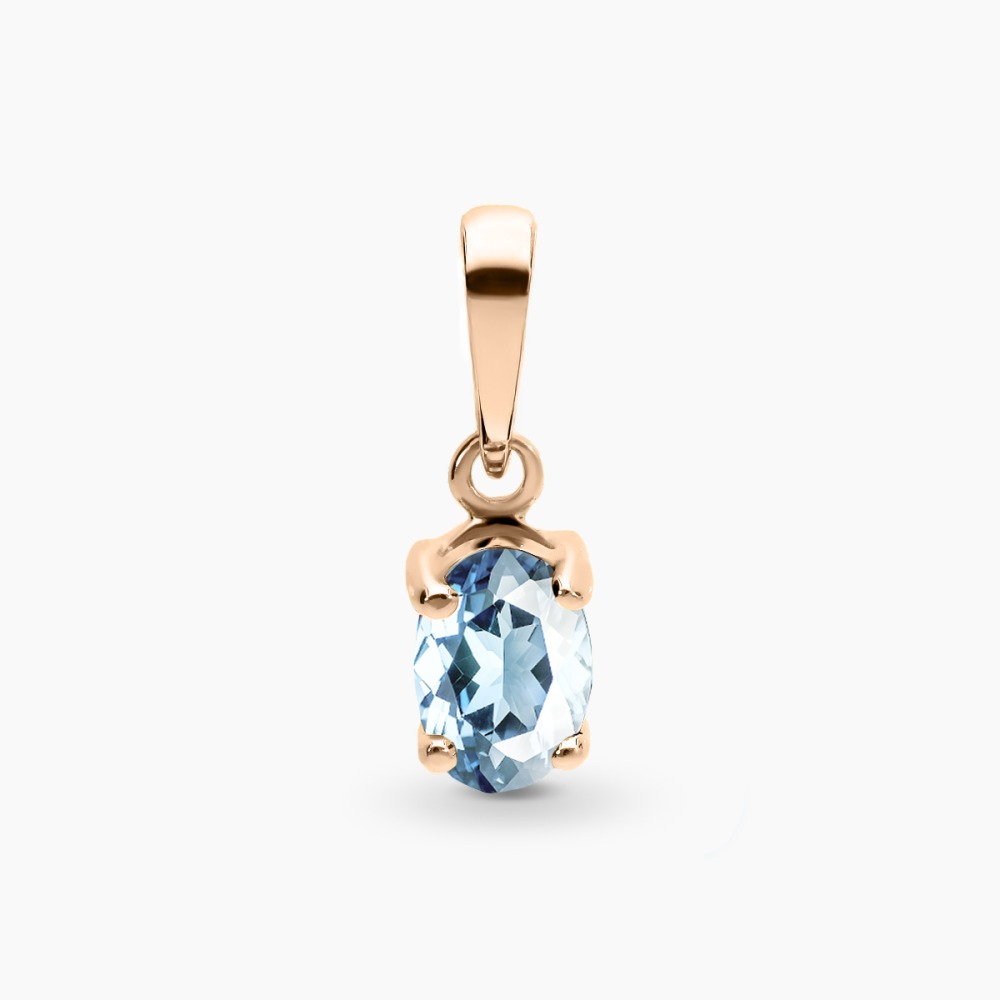 Urzekająca zawieszka wykonana z dbałością o detale w pracowni A&A z różowego złota próby 585. Jej centralny element stanowi wyjątkowy, owalny topaz sky o pięknym kolorze. Kamień idealnie komponuje się z oprawą z drogocennego kruszcu o ciepłej barwie i wspaniale wygląda w połączeniu z różnymi splotami łańcuszka. Pełna wdzięku kompozycja sprawdzi się jako wspaniały dodatek do wielu stylizacji i prezent dla miłośniczki subtelnych dodatków.