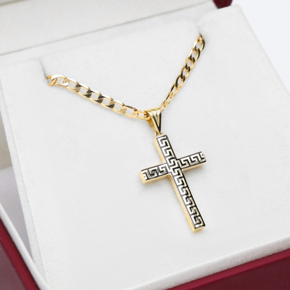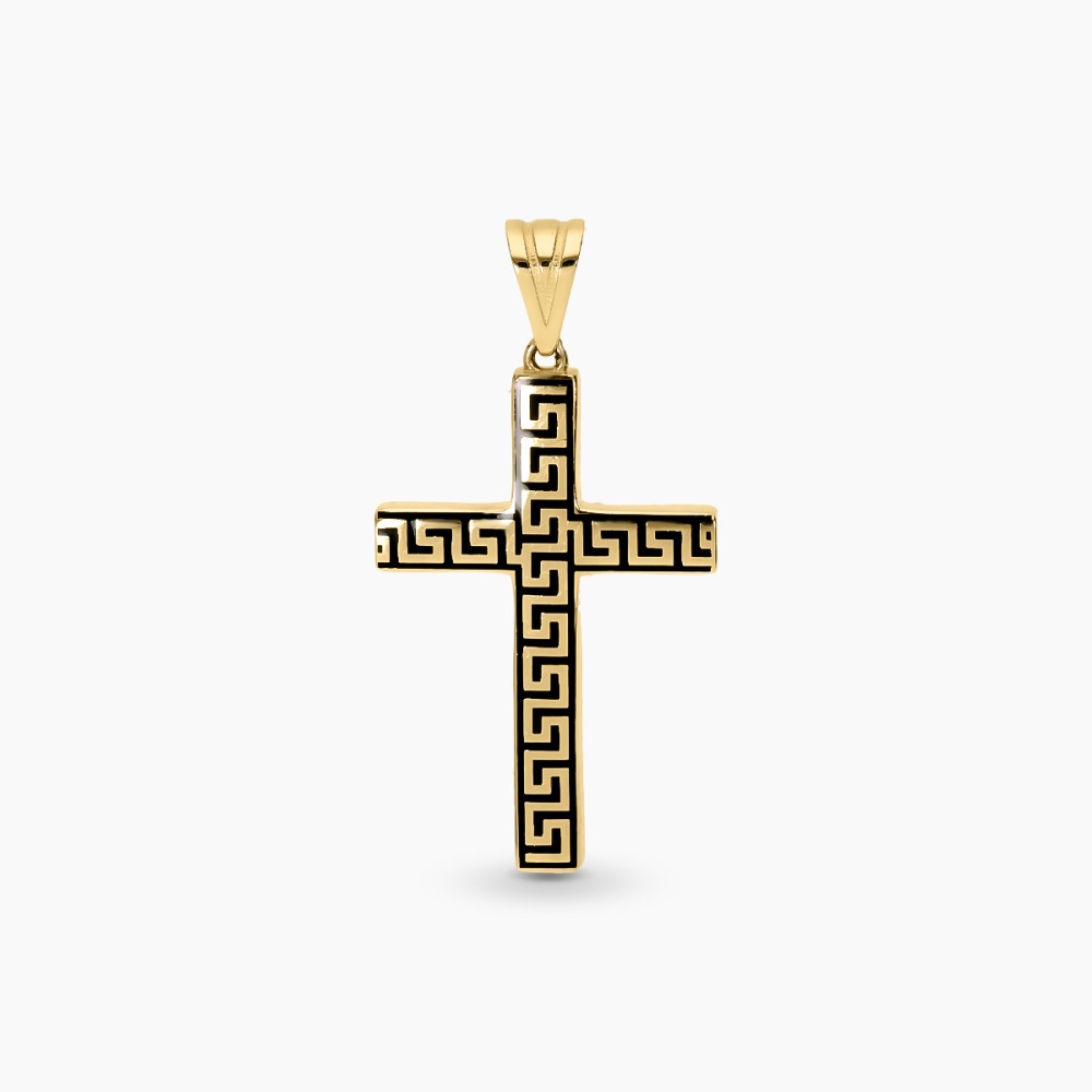 Wyjątkowa zawieszka w kształcie krzyża, wykonana z żółtego złota próby 585. Gładką, lśniącą powierzchnię ozdobiono emalią jubilerską oraz dekoracyjnym greckim wzorem, który dodaje całości wyrazistego charakteru. To niebanalny model, który pięknie prezentuje się na łańcuszku i doskonale sprawdzi się jako stylowy dodatek do codziennego noszenia.
